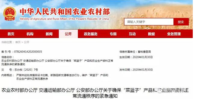 近期,因防范新型冠狀病毒感染的肺炎疫情,一些地方“菜籃子”產品和農業(yè)生產資料運輸受阻,出現(xiàn)蔬菜等“菜籃子”產品出不了村、進不了城,畜禽養(yǎng)殖所需飼料難以及時補充,種畜禽無法調運等問題。為確?!安嘶@子”產品市場供應和農業(yè)生產穩(wěn)定發(fā)展,現(xiàn)就有關事項通知如下。